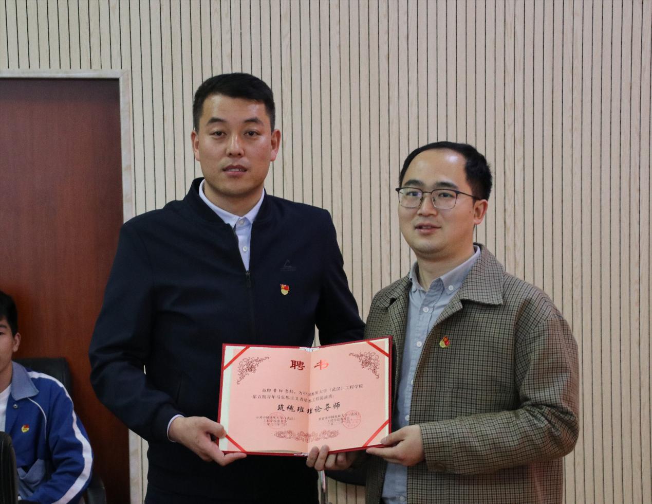 高晓东老师代表学院聘请曹阳老师为学院第五期青年马克思主义培养工程提高班“筑魂班”理论导师,并为砺行宣讲团授旗。