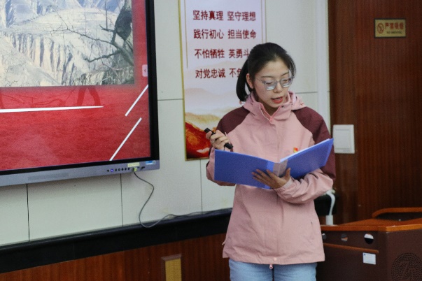 地球深部研究生党支部的杨鑫茂以《在历史中回望,从新时代出发》为题,围绕党的过去五年和新时代十年伟大变革的重大意义,以小窥大,从自身家乡发展引入,生动展现了祖国十年间发生的翻天覆地的变化,回顾了在祖国发展各个阶段做出突出贡献的青年典型人物事迹,并对站在新的历史起点的新时代青年提出了号召,鼓励广大学生党员勇担时代重任,志存高远,坚定向前。