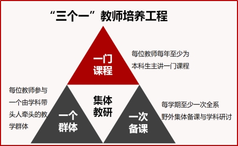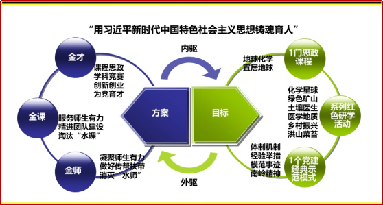 地球化学系党支部认真贯彻执行党的路线方针政策,牢记地化“南岭精神”——集中力量办大事的精神、团队精神、科学精神、创新精神,紧扣时代脉搏,将扎实基础、宽阔视野、又红又专定位为地化人坚定迈步的必备武器。支部始终坚持用习近平新时代中国特色社会主义思想铸魂育人(图1),实现“三个一”教师培养新工程(图2),在学科带头人牵头的教学群体中,实现跨越式传承与创新,使原有的教师“单兵作战”模式向跨学科集体教研模式转型,建成了一支潜心治学、在国内外有影响力的教研梯队(图3),成为推动地球化学理实相融人才培养的红色引擎。