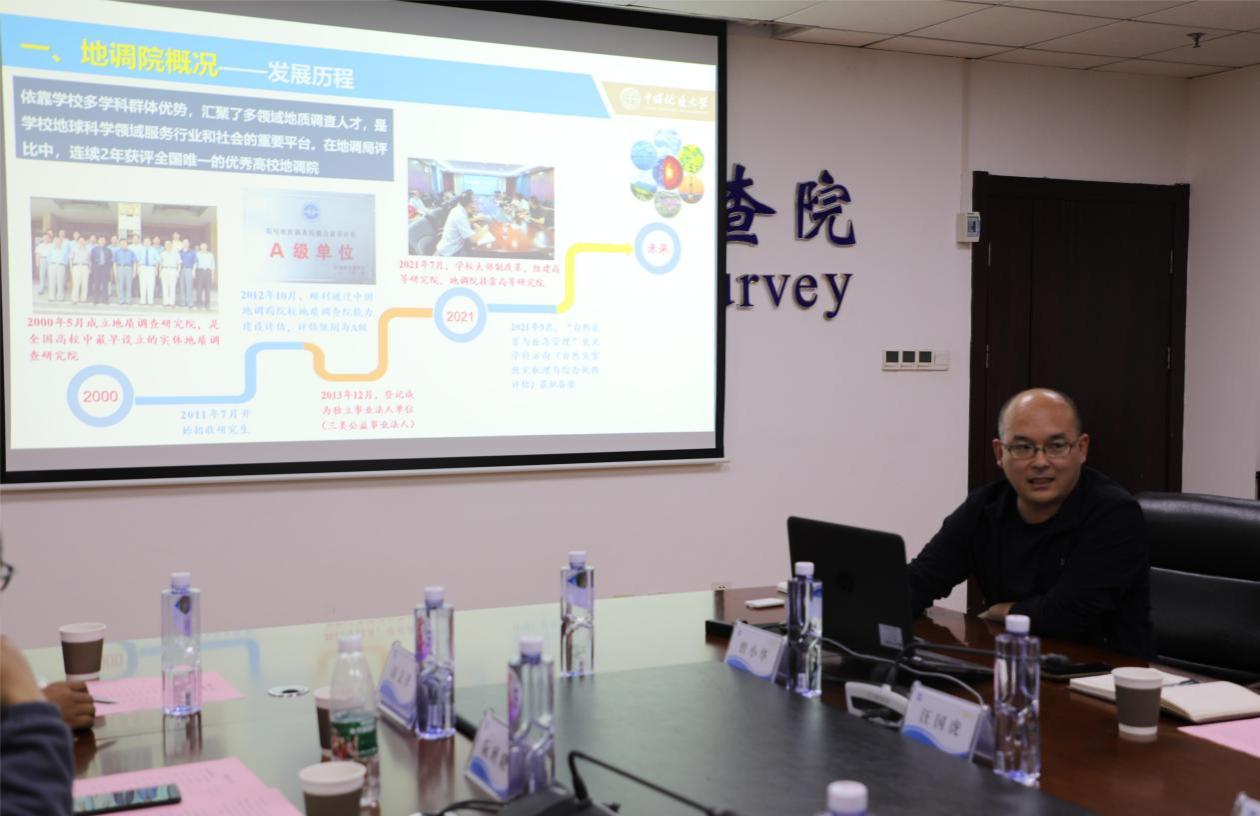 在业务研讨环节,湖北省地调院党委委员、副院长孙四权和地大地调院副总工程师、院长助理高顺宝分别介绍单位基本业务情况。接着,与会人员围绕“学习贯彻中央精神、提升履职服务能力”、“深入学习回信、先行建新功”两个主题,开展讨论交流。