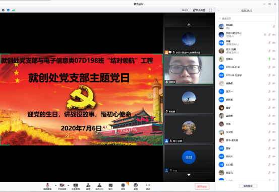 (通讯员:陈昭颖 陈慧)7月6日,就创处党支部全体党员与结对领航工程的结对班级电子信息类07D198班通过腾讯会议在云端开展了一场别开生面的主题党日活动。本次主题党日活动以“迎党的生日、讲战疫故事、悟初心使命”为主题,邀请校医院刘艳华医生分享“战疫”故事,支部书记陈慧同志担任主持。