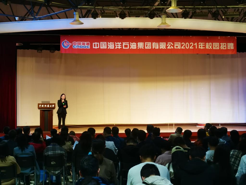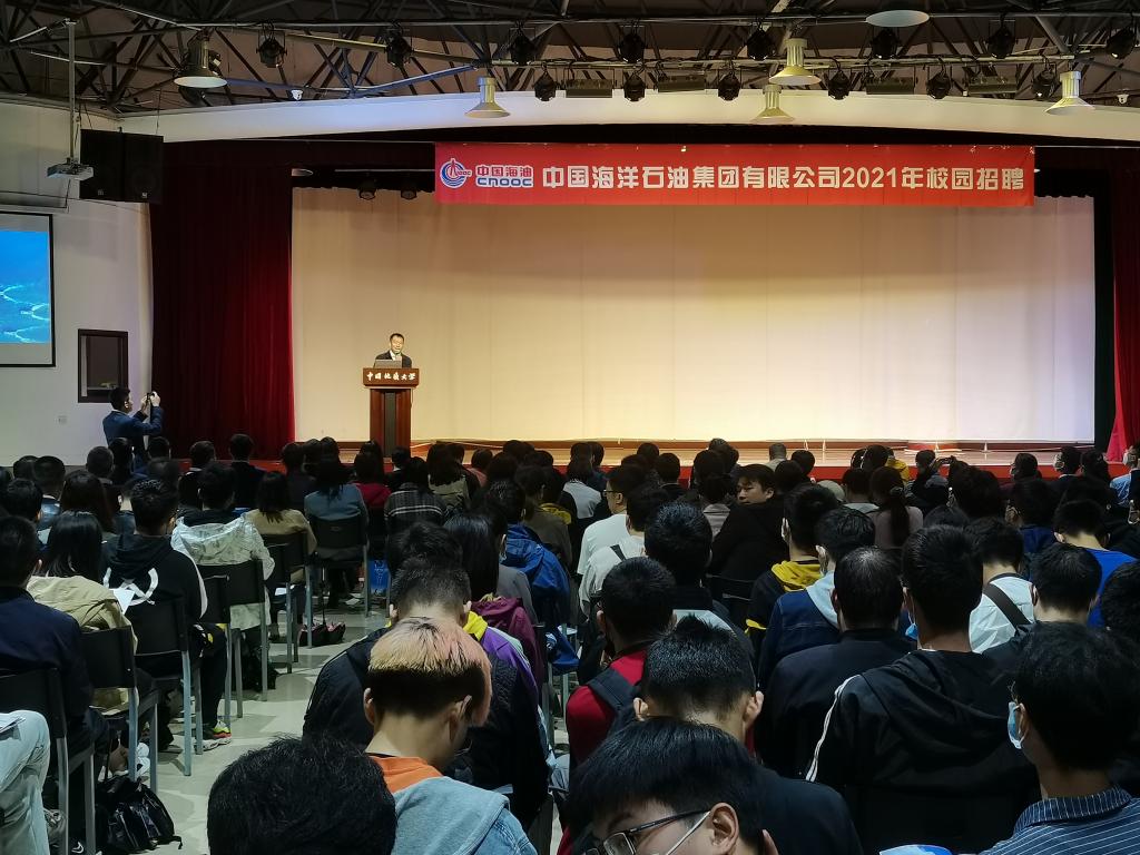晚上19:00,在大学生活动中心二楼演播厅召开宣讲会。宣讲会环节由就创处副处长沈波主持。严嘉代表学校致欢迎辞,戴照辉代表中海油宣讲,湛江分公司、深圳分公司、上海分公司、海油国际、中联公司、中海油服、海油发展、中海化学等8家分公司分别宣讲。宣讲会后同学们开始根据个人意愿投递简历。16日上午中海油各分公司分别在教三楼和教一楼展开面试。