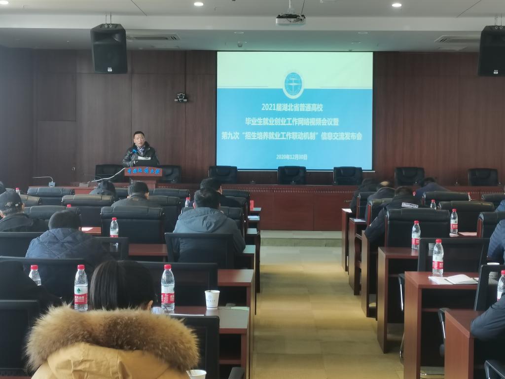 会议开始,参会人员集中收看了由湖北省教育厅、湖北省人力资源和社会保障厅联合组织的“湖北省2021届普通高校毕业生就业创业工作网络视频会议”。襄阳市人社局、武汉理工大学、湖北工业大学、湖北第二师范学院、武汉工程科技学院、襄阳职业技术学院六家单位分别就各自2020届毕业生就业创业工作进行了汇报交流。湖北省人力资源社会保障厅副厅长董长麒介绍了2020年就业市场情况及政府采取的及时应对措施。湖北省教育厅副厅长张金元用“极不平凡、科学政策、成效明显”三句话总结了2020年湖北省高校毕业生就业创业工作,并提出做好2021年就业创业工作八个方面的要求,强调各高校要把就业工作作为重要政治任务,书记、院长和院系的主要负责人要整合一切可以整合的资源,确保完成“稳就业”目标。