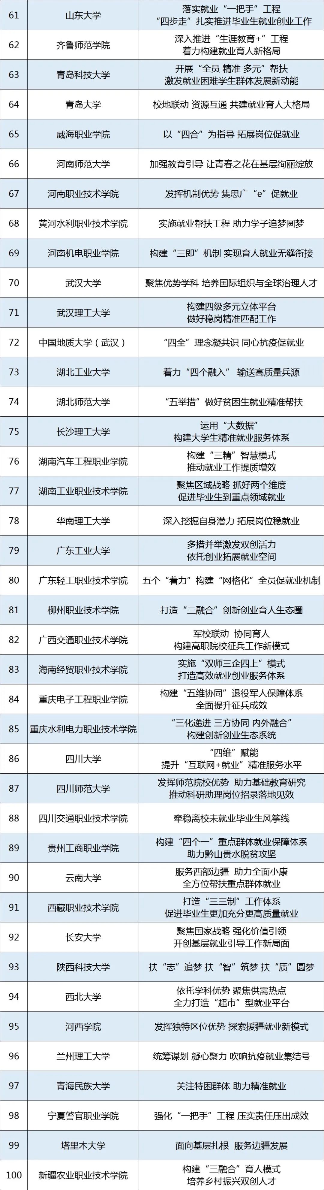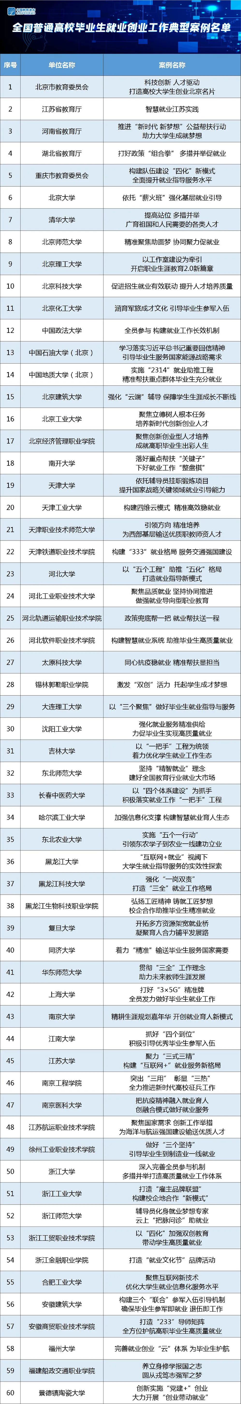 教育部公告指出,受新冠肺炎疫情等因素影响,2020届高校毕业生就业形势严峻复杂。各地各高校和有关单位认真落实党中央、国务院“稳就业”“保就业”决策部署,开展了大量卓有成效的工作,确保了就业局势稳定,涌现出大批先进典型。为总结推广工作中的典型经验做法,教育部启动了全国普通高校毕业生就业创业工作典型案例总结宣传工作,经各地各高校申报推荐,专家择优遴选,确定了100个典型案例。