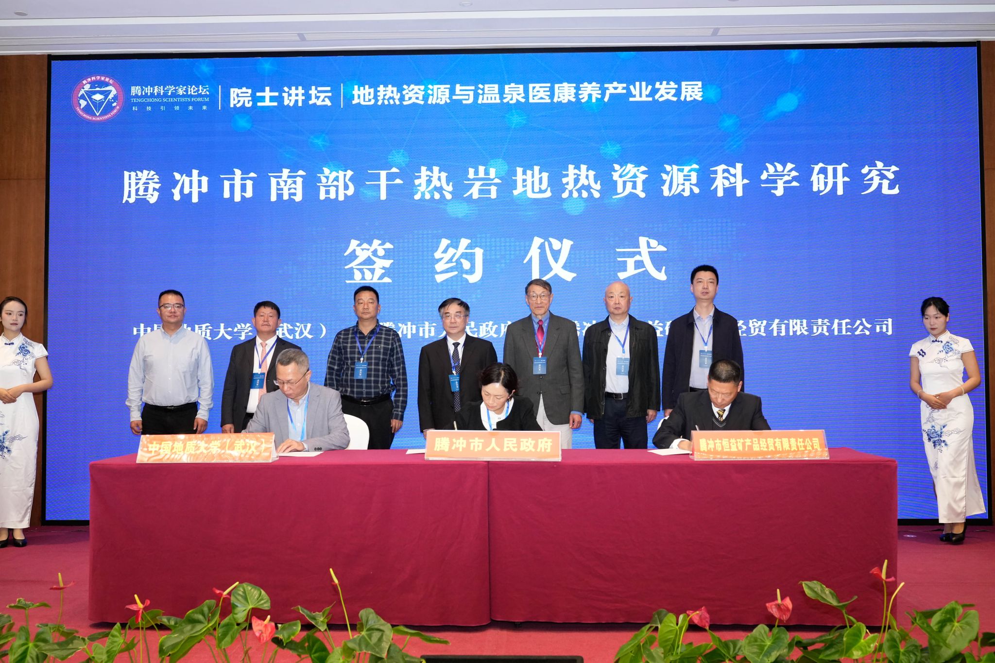 论坛期间,学校与腾冲市人民政府、腾冲市恒益矿产品经贸有限责任公司共同签署“腾冲市南部干热岩地热资源科学研究”三方合作框架协议,与腾冲市人民政府等多家单位共同启动《云南温泉康复治疗地图》项目。