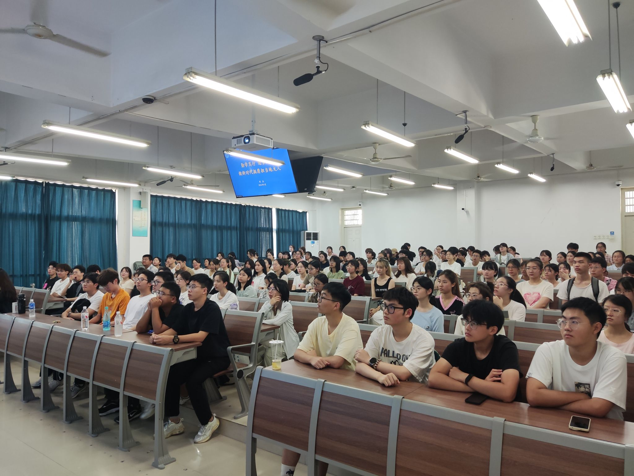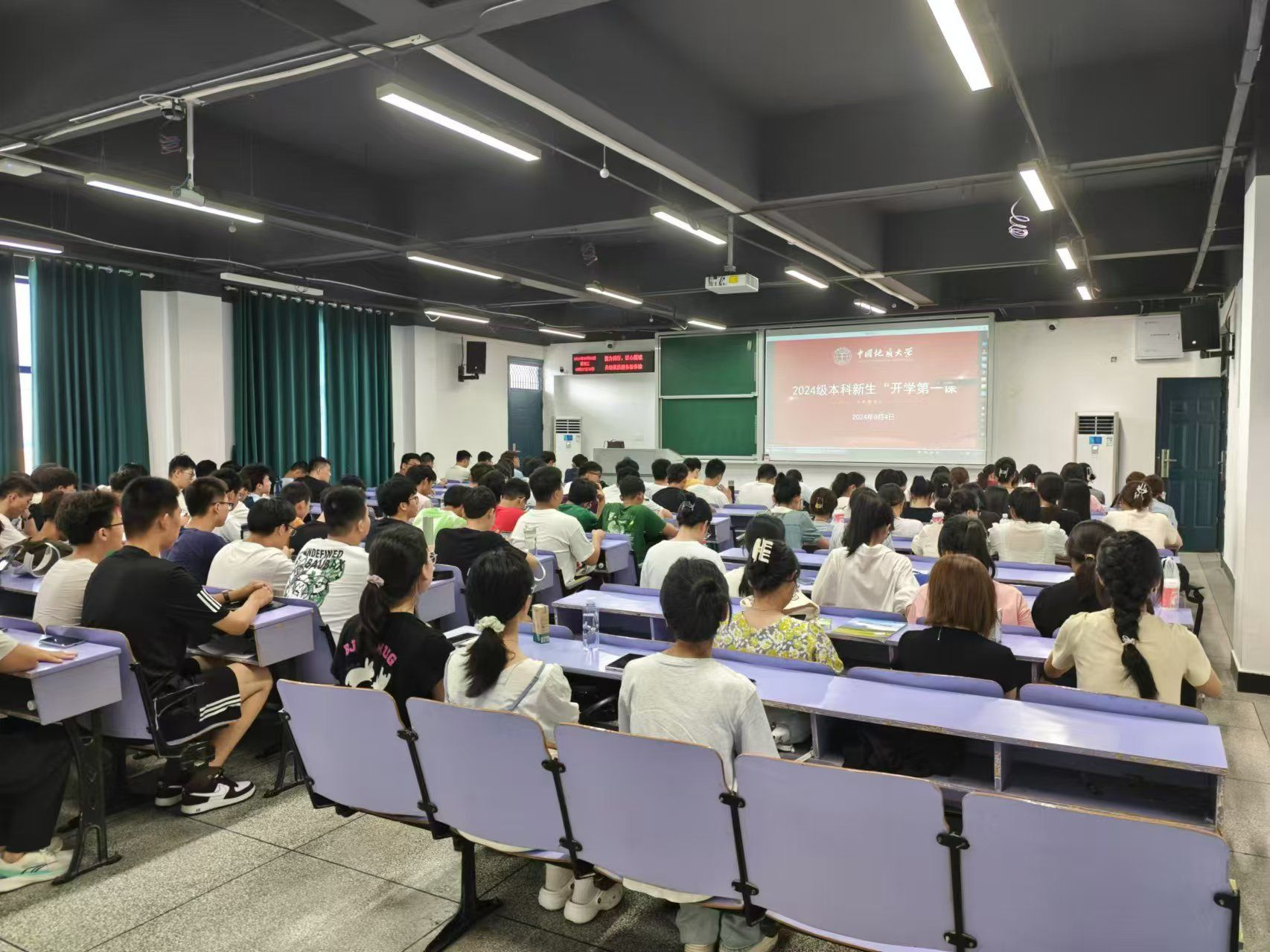 “开学第一课”实行现场直播,全校4800余名新生线上线下同步学习。