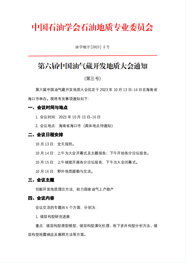 转发《第六届中国油气藏开发地质大会3号通知》