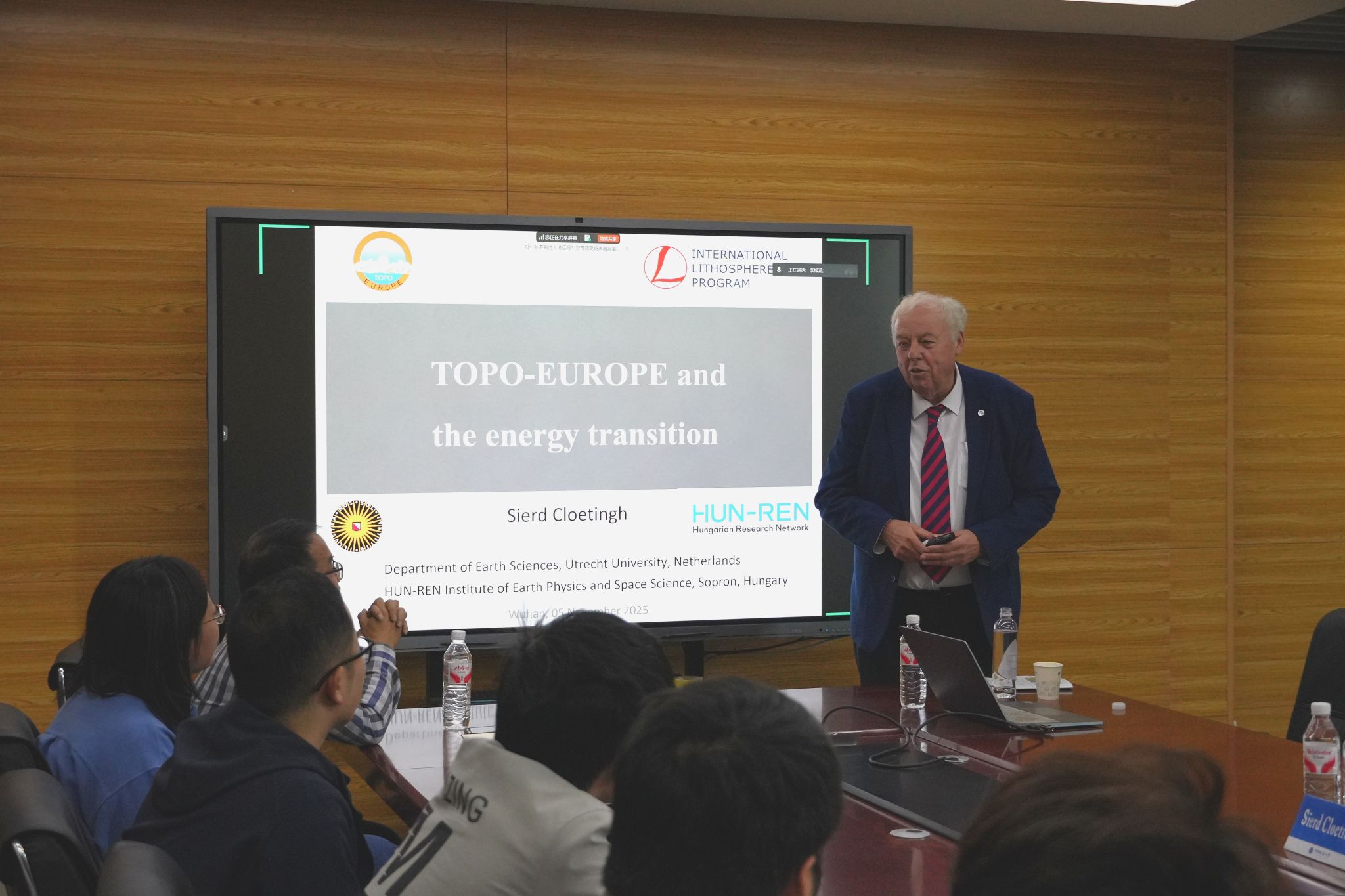 Sierd Cloetingh教授以“TOPO-EUROPE与能源转型”为题作报告。他从地球系统整体视角出发,系统阐释了欧洲岩石圈地形演化与全球能源转型之间的深层联系。教授指出,岩石圈动力学过程不仅塑造了地球表面的地貌格局,更直接影响着地热能、地质储能及天然氢等新能源资源的形成、分布与开发潜力。