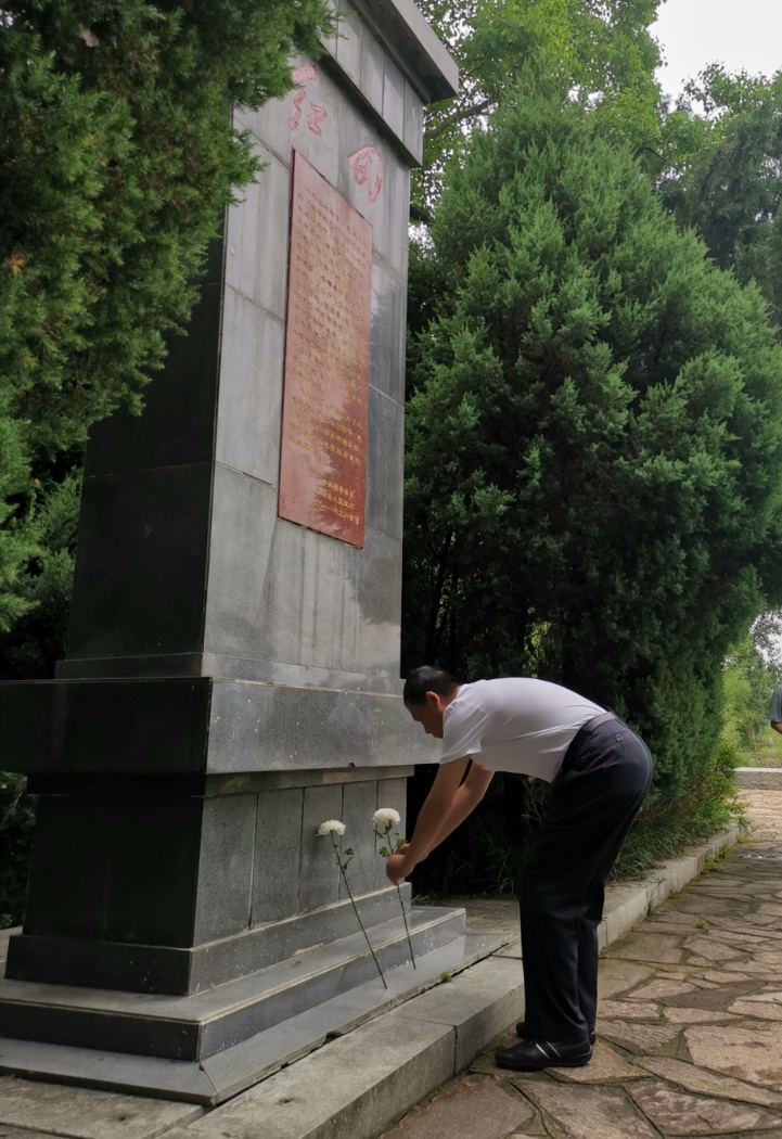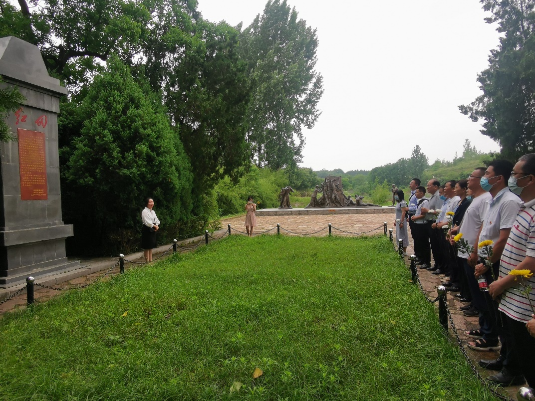 “每平方米至少倒下10名烈士,抓起一把泥土都能攥出血来啊!”讲解员讲到此处,在场党员无不动容,一时间热泪盈眶。大家在红田惨案遗址前默哀,献上鲜花并鞠躬致敬。