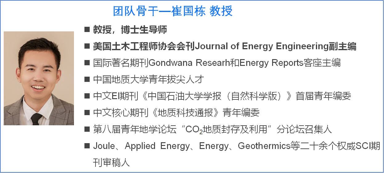 崔国栋教授,博士生导师,国际期刊Journal of Energy Engineering副主编,国际著名期刊GondwanaResearh和Energy Reports客座主编,中国石油大学学报和地质科技通报青年编委。一直以来聚焦CO2地质封存、CO2-采热储能方面的研究。近五年,主持或参与国家重点研发计划、国家自然科学基金和省市自然科学基金等10余项,以第一作者发表CO2地质封存及地热开发论文30余篇,其中ESI高被引论文6篇,中科院一区论文10篇。研究工作成果被Renewable Energy Global Innovations作为Key Scientific Article进行了特别报道,促进了CO2地质封存和资源化利用研究进展。